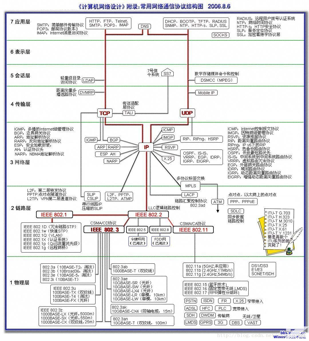 因特网协议栈共有五层:应用层、传输层、网络层、链接层和物理层。不同于OSI七层模型这也是实际使用中使用的分层方式。 互联网的每一层,都定义了很多协议。这些协议的总称,就叫做"互联网协议"(Internet Protocol Suite)。它们是互联网的核心,下面介绍每一层的功能,主要就是介绍每一层的主要协议。