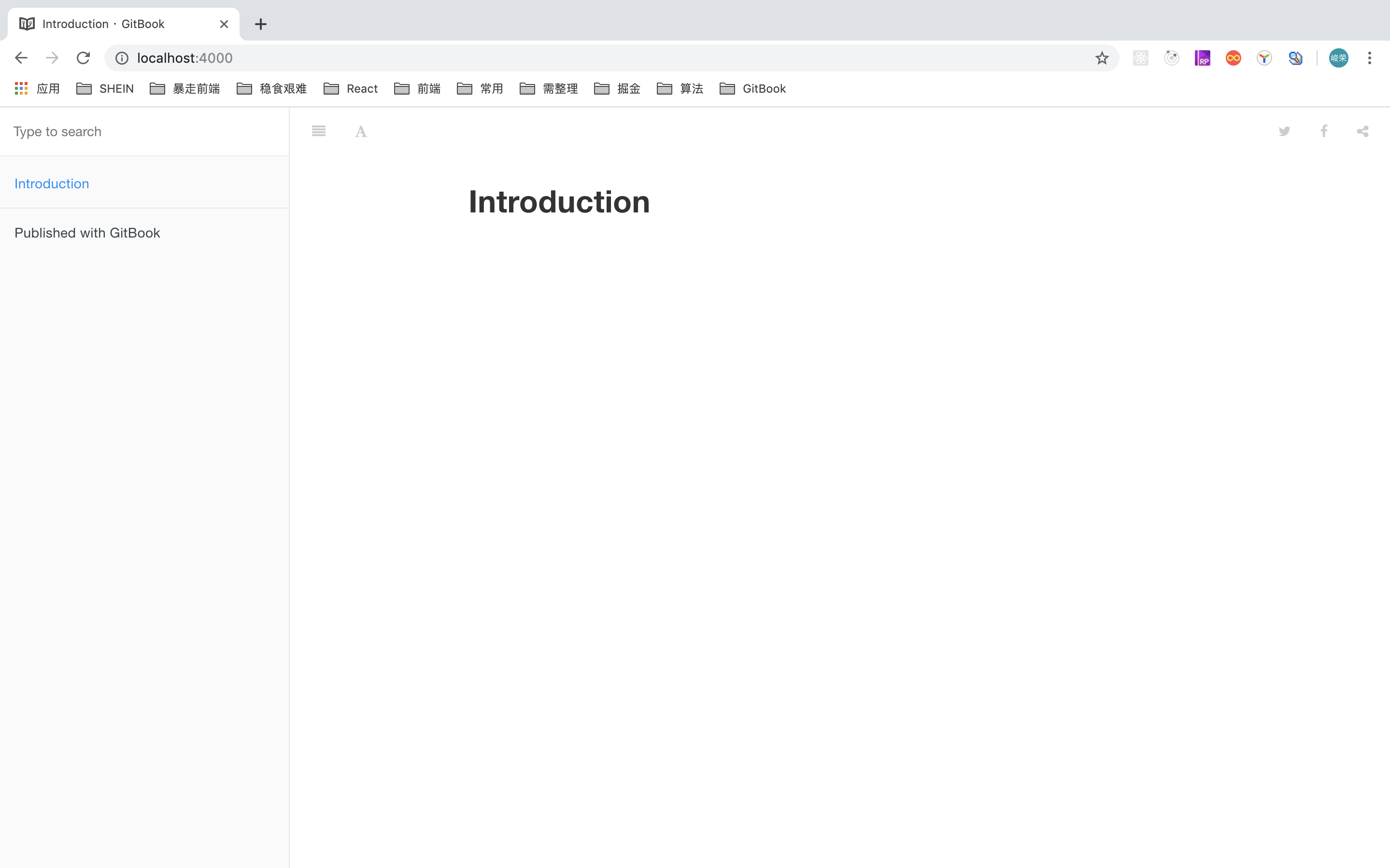 最后,我们在 终端 输入 gitbook serve 即可开启一个 localhost:4000 的服务,请在浏览器中输入 http://localhost:4000 即可访问服务。